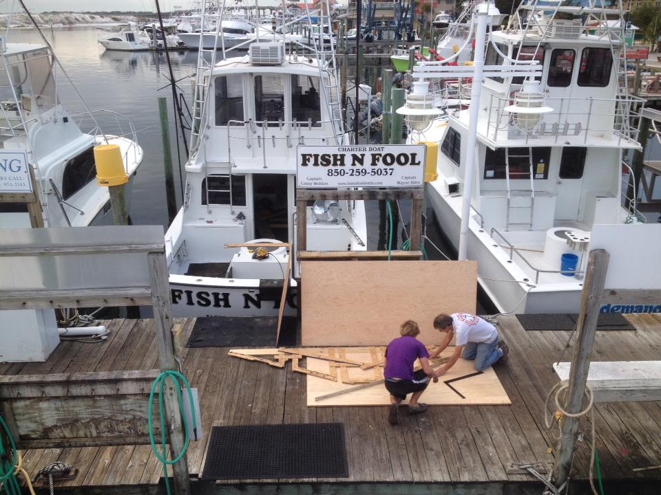 Sword Fishing in the Gulf of Mexico on the FISH N FOOL & the LADY EM. Sword fishing offshore of Destin is done around the 100-fathom curve, which is 50-60 miles offshore. We typically set the boat up to drift over the depth contours that we want to fish that night. The swordfish come up in the water column at night to feed near the surface. We like to swordfish! We like it a lot!!! For us, it's a chance to go one on one with a big mean fish both of us down on the deck, working with the angler and loving life. Swordfish are awesome and they get our blood pumping! And their good to eat!!! No matter how much of a sport fisherman I am, I still like to kill something to eat. It?s just practical. Yes it's a big beautiful, strong fish, and it's also good to eat! BONUS!! We love to fish for swordfish!! Its normally slick calm with a full moon or a partial moon, the boat is drifting in the current with the motors off and all the lights shining. It's just nice, its quiet and its peaceful!! And then of course you get the bite and it's on!! What a blast. Drifting at night in 1-3 thousand feet of water with the underwater lights lighting up the water around the boat. Whole squids and glow sticks fished 150 to 300 feet below the boat. The music's playing, there are a couple of million stars out and life is good!! Typically we will fish 3 or 4 lines at a time staggered at a couple of depths. Sometimes we wait hours for a bite and sometimes we get a bite within a few minutes. Sometimes we have two on at a time. If you get three or 4 bites and catch one or two swordfish, it's a good night. Swordfish are big powerful fish with a 3-5 ft sword attached to the swordfish's face and he knows how to use it to his advantage. Swordfish have a thick tail and a powerful stroke and the fight is typically a straight up and down battle with the swordfish occasionally coming to the surface to jump. Of course it is at night so all you see is the glow stick out there jumping up and raising cane and the line stripping off the reel. Very exciting!! Gain 30 ft; lose 40 ft, give and take. Keep steady pressure on him and hang on for the long battle. The tackle that we use for sword fishing is custom-built stand up rods with gold Penn International 50 wide reels with a full body harness, so that you can fight them with a harness or with the post on the boat.